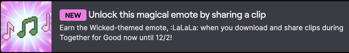 For the first time ever, Twitch leaned heavily into the Wicked IP, giving our sponsor extensive amounts of real estate across highly coveted assets like the program logo, global emotes, chat badges, and on-site notifications.